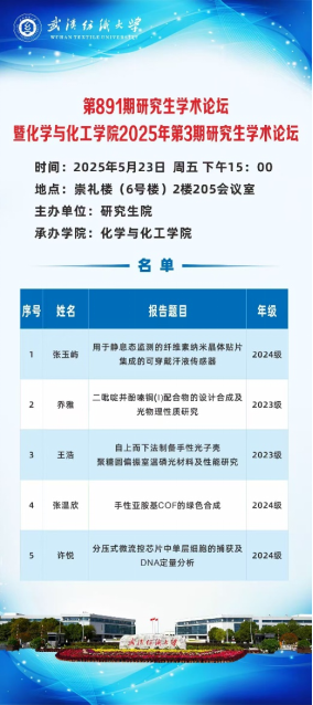 5月23日下午,化学与化工学院在6号教学楼205号会议室举办了第891期研究生学术论坛暨化学与化工学院2025年第3期研究生学术论坛。化工学院研究生王浩、乔雅、张玉屿、许悦和张温欣受邀做学术报告。学院师生代表20余人参加论坛。