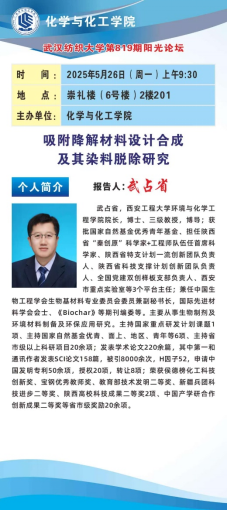 5月26日上午,化工学院在6号楼201举行了校第819期阳光论坛。西安工程大学武占省教授应邀来化工学院进行学术交流,并作题为“吸附降解材料设计合成及其染料脱除研究”的学术报告。论坛由化工学院院长朱君江教授主持,学院师生代表参会。