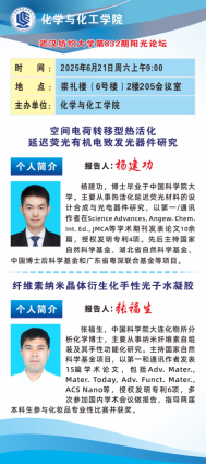 6月21日上午,化学与化工学院在阳光校区崇礼楼509会议室举办学校第832期阳光论坛,张福生和杨建功老师分别作题为“空间电荷转移型热活化延迟荧光有机电致发光器件研究”和“纤维素纳米晶体衍生化手性光子水凝胶”的报告。学院教师及研究生代表参与了此次论坛。