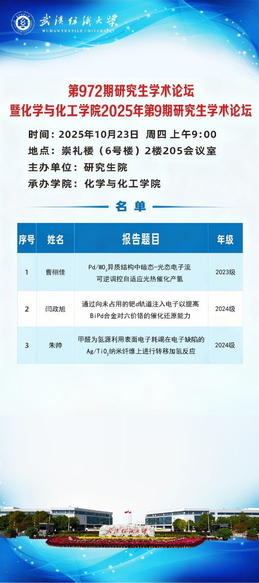 10月23日上午,学院在阳光校区6号教学楼205会议室举办校第972期研究生学术论坛暨学院2025年第9期研究生学术论坛。化工学院刘丽君、Aimal Khan等教师,以及研究生、本科生和留学生代表共计二十余人参加。