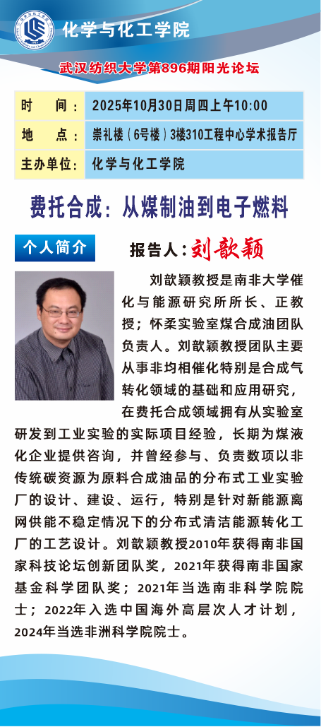 10月30日上午,化学与化工学院在崇礼楼310学术报告厅举办校第896期阳光论坛。非洲科学院院士刘歆颖教授应邀作题为“费托合成:从煤炭到液体再到电子燃料生产”的学术报告。论坛由化工学院院长朱君江教授主持,学院师生代表参会。