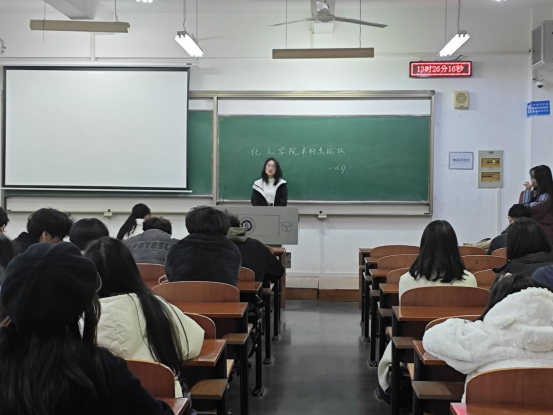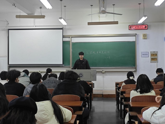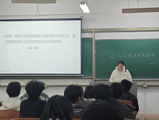 化学类12504班的周星佑同学带来了题为《利用气相模板法辅助芬顿污泥衍生2D - MOH催化剂,同时结合淬火处理调控二维异质结电子结构优化芬顿污泥衍生催化剂的潜在催化性能》的报告。化学类12502班的龚玉萍同学以《镧掺杂调控铜基氧化物的催化活性位点:面向高效电催化反应的性能优化与机理探究》为题进行分享。化学类12501班的石安旗同学则带来了跨领域的研究成果展示,内容涵盖《培养类器官用于替代动物实验、药物研发和人工智能在锂离子电池健康状态监测中的应用》。