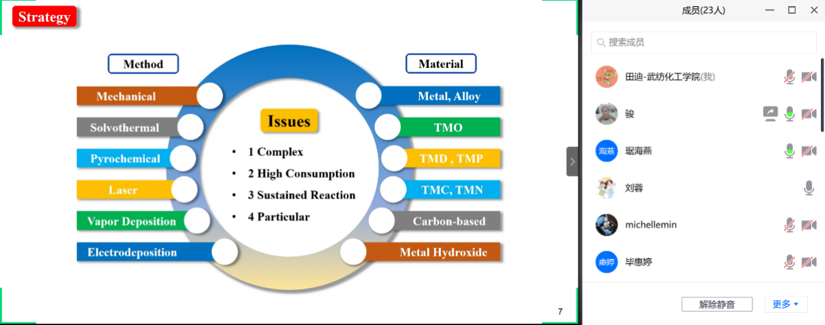 万骏主要从事能源转换及存储研究,长期致力于利用微波技术制备及改性过渡金属基电极材料,并将其应用于超级电容器、电催化及盐差发电等领域。此次线上沙龙活动中,他对微波诱导制备及改性过渡金属氧化物、碳化物及石墨烯基纳米材料进行了深入讲解,探究了材料本征导电性和催化活性对电化学性能的影响,并对今后的研究工作进行了全面展望。