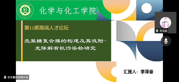 李博士做了“壳聚糖复合膜的构建及其吸附-光降解有机污染物研究”的报告。通过研究并制造了一种壳聚糖复合膜,该复合膜具有优异的吸附和光降解性能,能够有效地去除有机污染物。这项研究为提高环境污染处理的效率提供了重要的贡献。