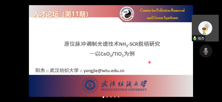 阳杰博士做了“原位脉冲调制光谱技术NH3-SCR脱硝研究"的报告”。在他的报告中提出了原位分辨脉冲调制光谱技术可以有效地控制催化还原反应的速率和产物组成。他的研究为进一步研究催化还原氮氧化物提供了重要的理论基础。