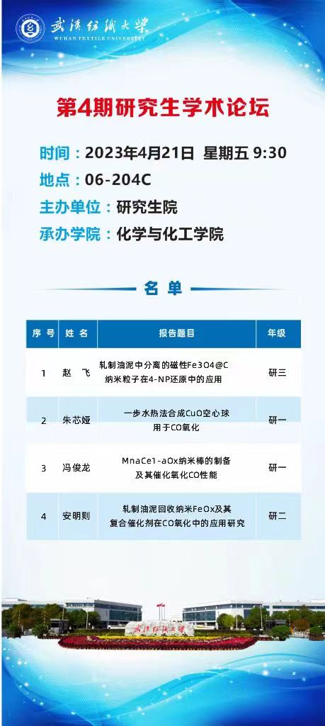 2023年4月21日下午,化工学院第4期研究生学术论坛于崇礼楼06-204C举行。相关研究生参加了本次研究生论坛。4位研究生赵飞、朱芯娅、冯俊龙、安明泽分别在此次论坛上作了报告,展示了炼油化工助剂等材料在催化领域中的应用研究。