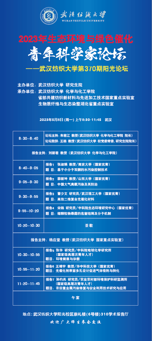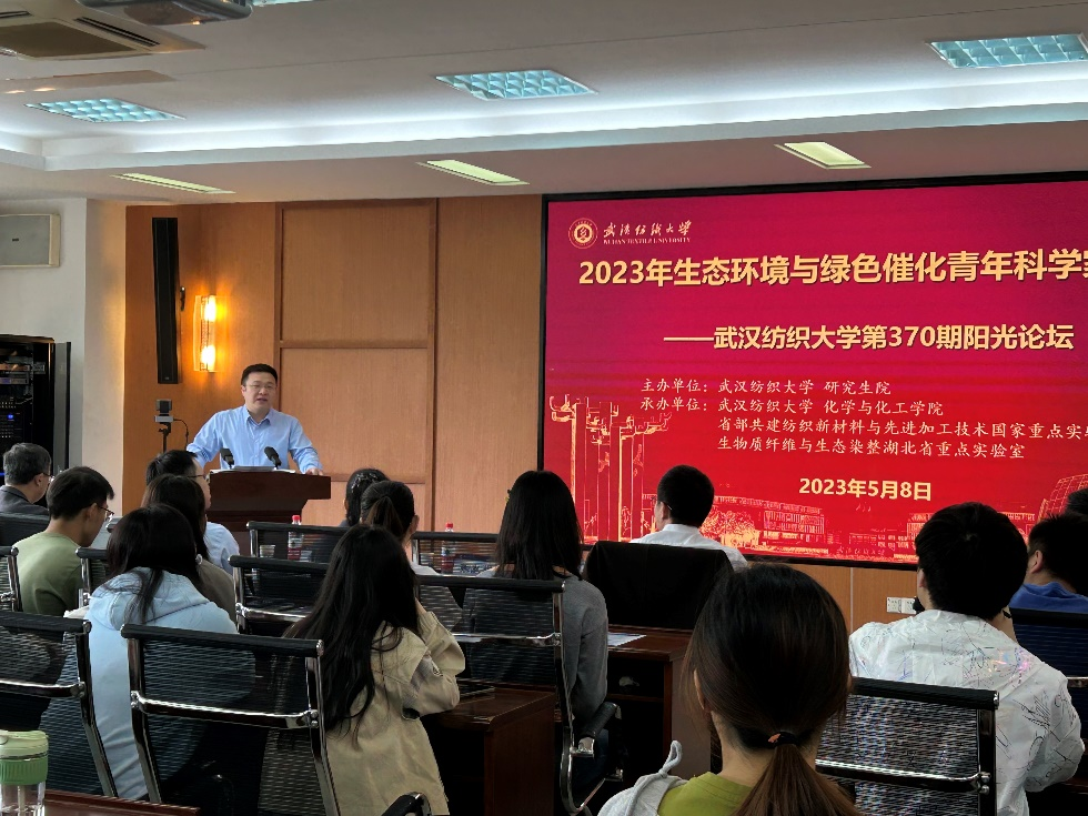5月8日,武汉纺织大学“2023年生态环境与绿色催化”青年科学家学术论坛在阳光校区崇礼楼(6号楼)310学术报告厅举行。本届论坛由武汉纺织大学研究生院主办,武汉纺织大学化学与化工学院、省部共建纺织新材料与先进加工技术国家重点实验室、生物质纤维与生态染整湖北省重点实验室联合承办。