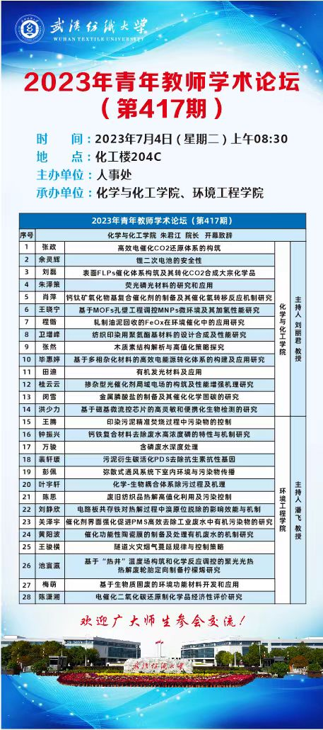 2023年7月4日上午,2023年第3期青年教师学术论坛在阳光校区崇礼楼(6号楼)204 C举行。28位青年教师汇报了各自研究成果。本届论坛由武汉纺织大学人事处主办,化工学院和环境工程学院联合承办。化工学院院长朱君江教授为论坛致欢迎辞,环境学院院长潘飞教授和化工学院刘丽君教授主持论坛。