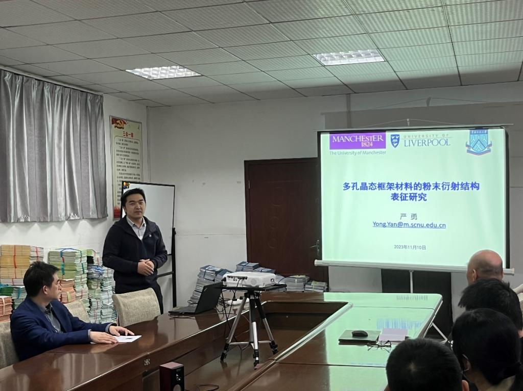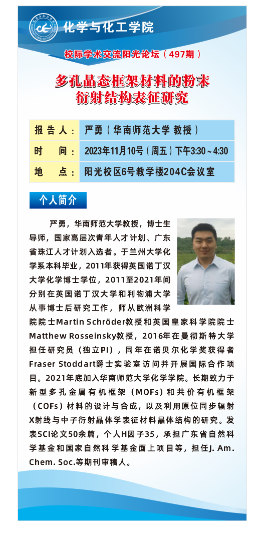 2023年11月10日上午,化学与化工学院在阳光校区6号教学楼204C会议室举办学校第497期阳光论坛,华南师范大学严勇教授就多孔晶态框架材料的粉末衍射结构表征研究做了精彩报告。论坛由刘丽君主持,学院教师、研究生及本科生代表30余人参会。