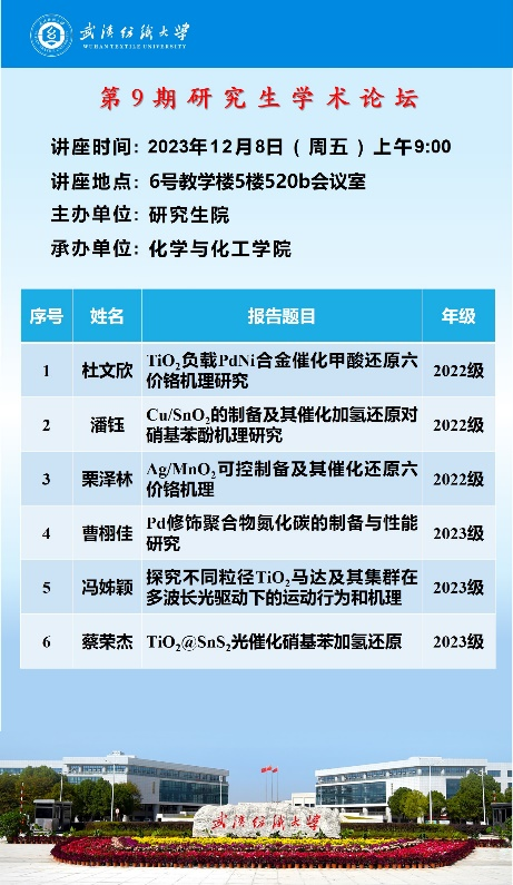 2023年12月8日,化学与化工学院第9期研究生学术论坛于崇礼楼520b会议室举行。刘丽君教授、林元博士、张健华博士和研究生代表参加了本次研究生论坛。6位研究生杜文欣、潘钰、栗泽林、曹栩佳、冯姊颖和蔡荣杰分别作了报告,展示负载型催化剂的制备及其在催化反应中的机理研究。