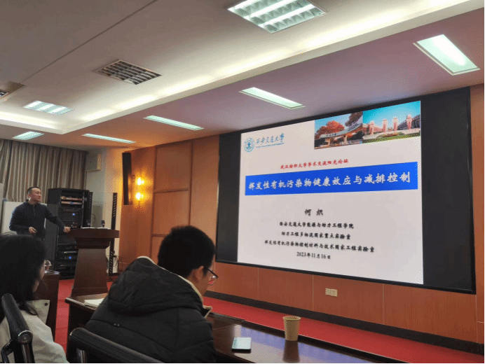 黄海保教授基于不同结构和反应活性的VOCs常温下靶向深度氧化方法和机制,介绍了纳米催化常温靶向氧化污染物、光解-催化协同产物转化机制、液相AOPs高效安全氧化脱毒策略三项研究工作。何炽教授基于大气污染控制化学方面的基础与应用研究,介绍了挥发性有机污染物健康效应与减排控制。报告结束后,两位报告人积极与参会师生互动,展开了深入的学术探讨。参与者们踊跃提问,与报告人就研究内容展开了富有成效的学术对话。
