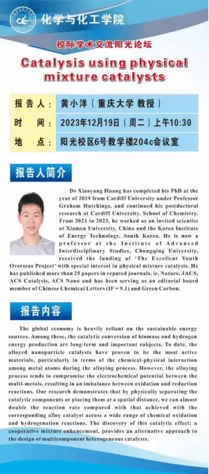 2023年12月19日上午,化学与化工学院在6号教学楼204C会议室举办学校第547期阳光论坛。本次论坛上,黄小洋教授做了题为“Catalysis Using Physical Mixture Catalysts”的精彩报告。论坛由化工学院院长朱君江教授主持,学院教师、研究生及本科生代表参会。