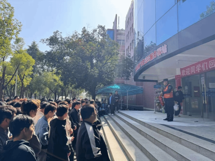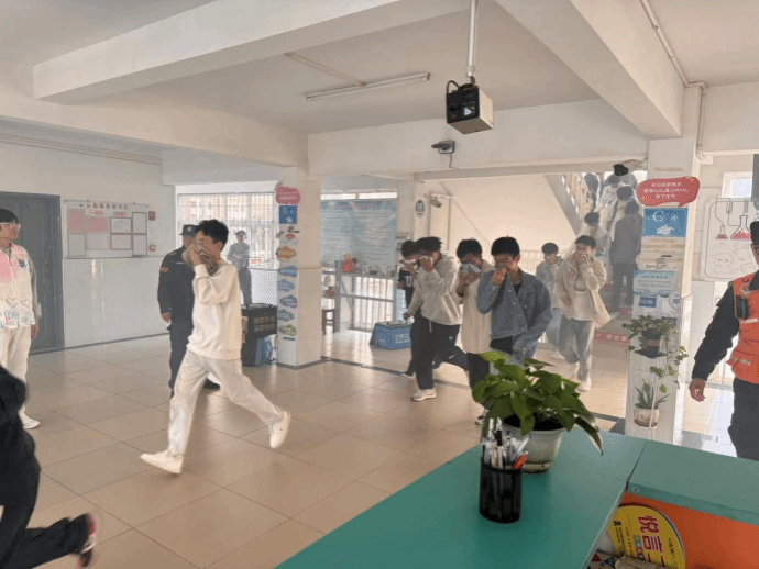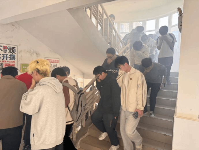 随着10位安全员的全部到位,火灾警报响起,演练正式开始。一栋学生公寓内的师生听到警报后,快速反应,立即停止手头事情或学习,在安全员的引导下,迅速有序地沿着逃生路线撤离至安全集合点。整个过程紧张而有序,师生们在确保安全的前提下高效疏散,几分钟便全部到达安全区域。安全员清点了人数,确保所有人员已全部撤离。