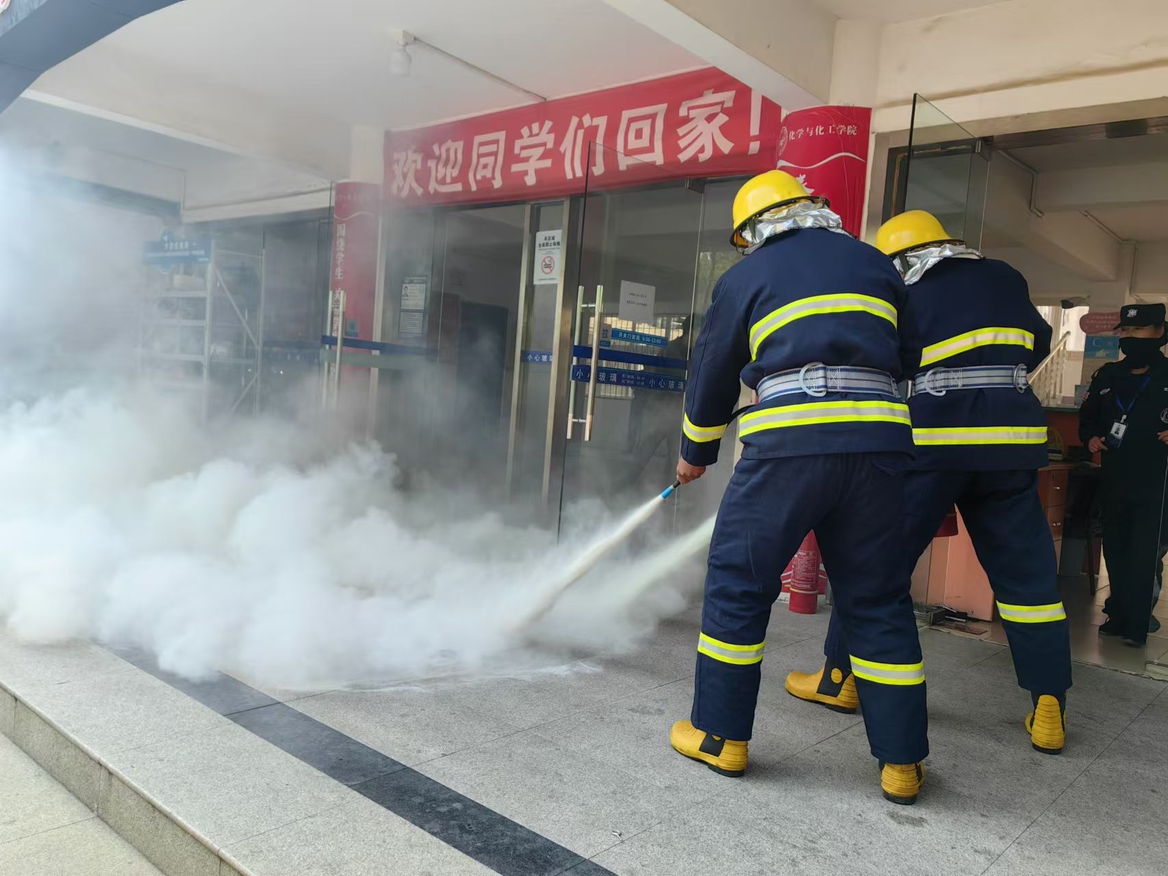 疏散演练结束后,保卫处消防科相关负责老师现场进行了灭火器使用培训,对灭火器的种类、操作步骤及使用要点进行了详细讲解,并进行了现场示范。