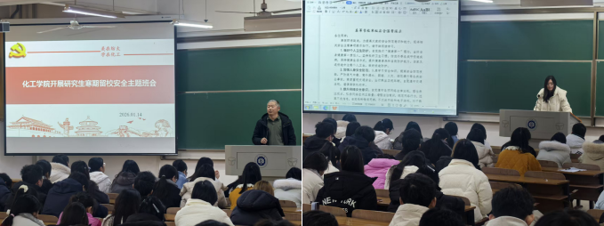 为切实做好寒假期间研究生留校安全管理工作,增强学生安全防范意识,1月14日,化工学院组织开展研究生寒假留校安全主题班会。学院副书记、辅导员及全体留校研究生参加会议。