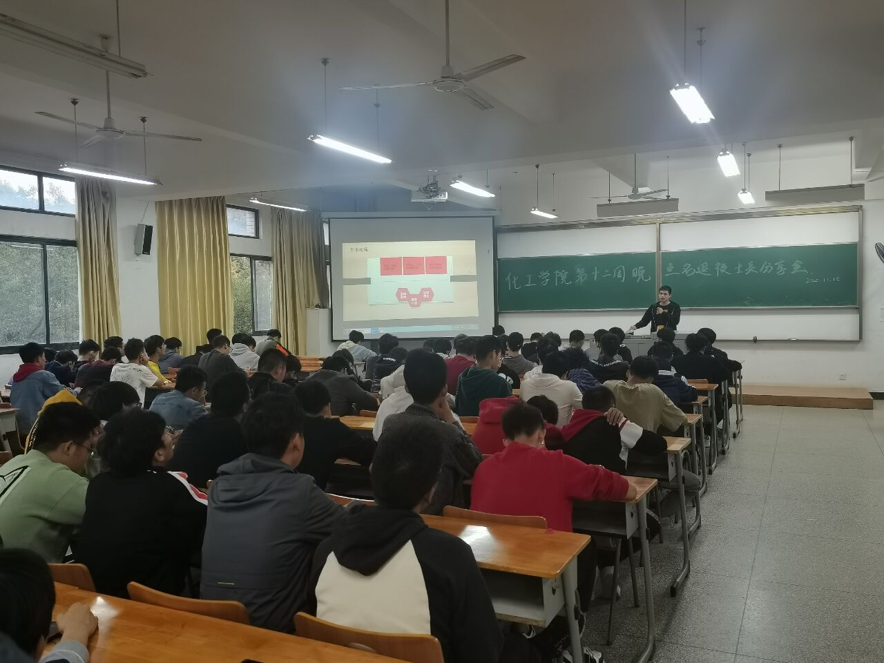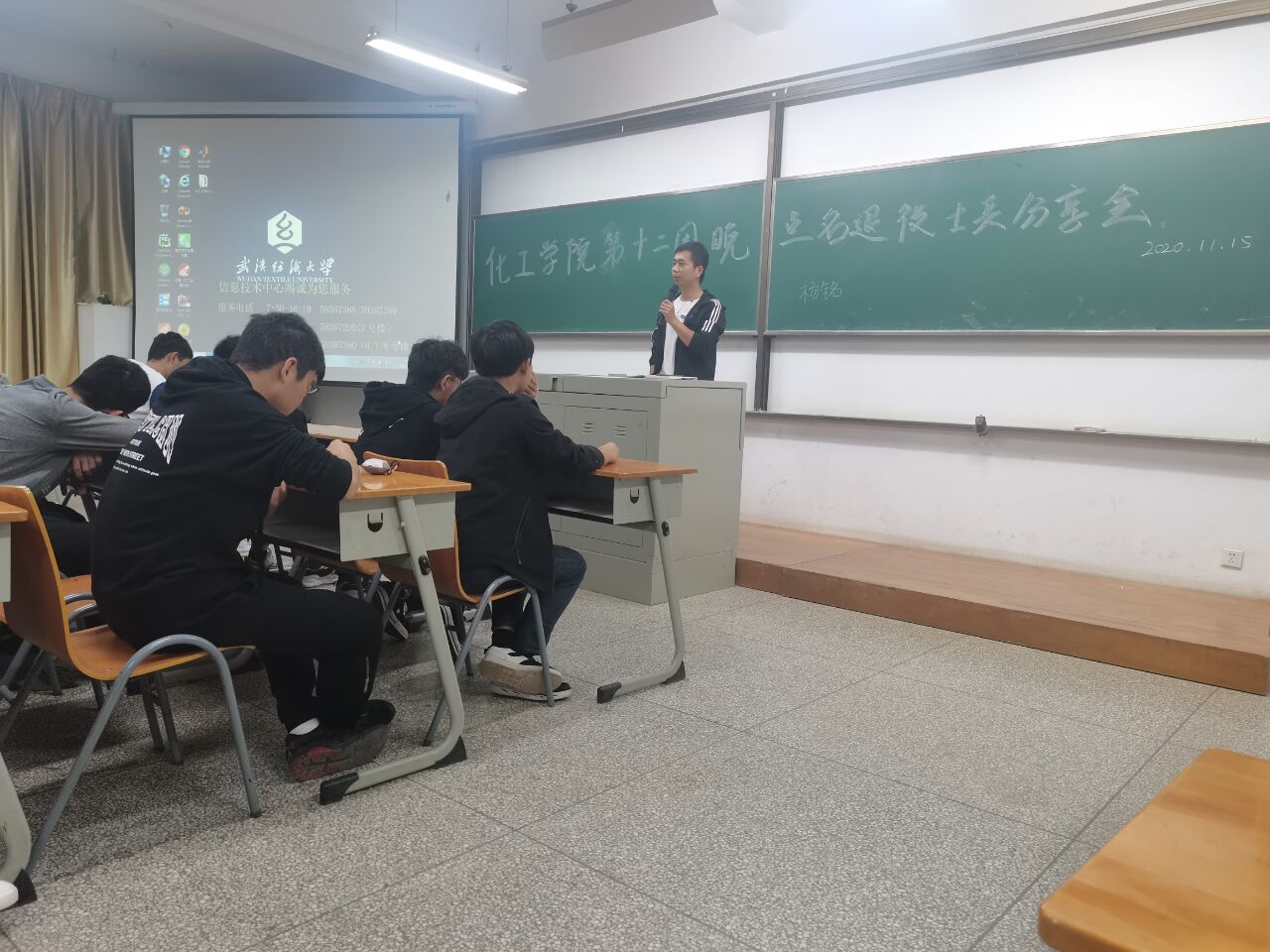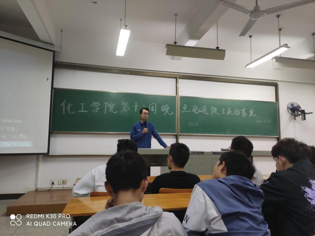 为调动20级学生入伍积极性,挖掘入伍积极分子,11月15日下午5点,化工学院在崇礼楼210教室,开启本学期“朋辈说”系列活动第三期,退伍大学生士兵王超龙、胡富林、周成杰与2020级男生分享他们的入伍故事。