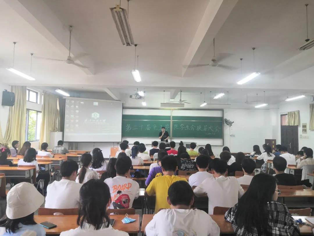 第二十届学生会主席周天枭首先感谢了校团委、学院、老师以及各位同学对学生会工作的的指导和支持,对过去一年半的时间里本届学生会工作所取得的成绩进行了简要总结,特别是对疫情期间学生会组织学生骨干积极参加各类抗疫活动进行了特别回顾,并对学生会的部门整合等改革进行了介绍。