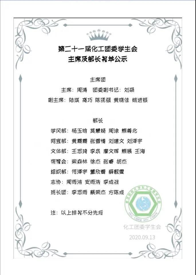 为进一步加强学院学生干部队伍建设,提升广大学生干部的服务能力与工作效能,更好地发挥老师学生间的桥梁作用,9月12日下午2点,化工学院团委、学生会换届大会在6号楼210教室举行。学院分团委书记谈鹏、全体学生会成员参加了会议。