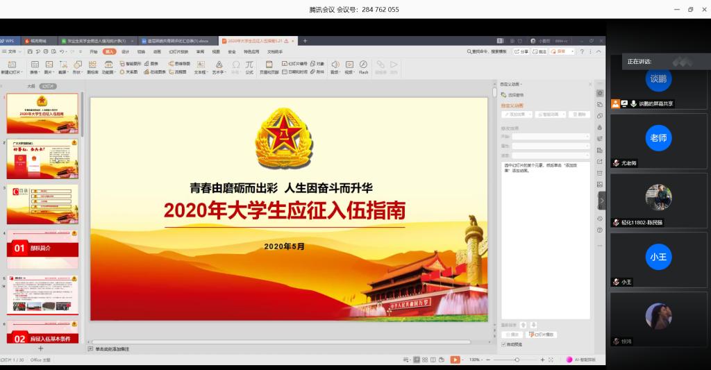 为进一步推进2020年征兵工作,激发学生从戎报国热情,近日,化工学院通过腾讯会议开展空中征兵宣传动员活动,活动由学院征兵联络员谈鹏主讲。