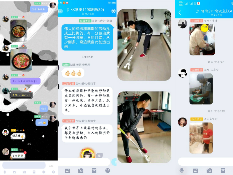 同学们围绕“五一“劳动节的主题,在家承担各种各样的家务,并把在家中进行的劳动成果以图片或文字的形式在班级群里展示和“晾晒”,并同时分享自己的心情,讲述自己劳动的小故事.有同学表示:“通过收拾,整个家变得干净整洁,心理也跟着开心起来。”有同学说:“享受自己做的美食,感觉到付出与收获,心情轻松愉快,充满成就感和满足感,相信这将会是一个难忘而快乐的记忆。”还有的同学掌握了包粽子的新技能,很是自豪和得意……