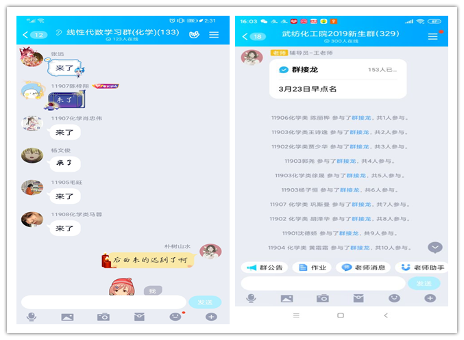 扫邀请码登陆课堂、线上督查学生上课、加入学生学习群聊……为加强学风督查与考勤管理,保证“线上教学”与“线下学习”同质同效,化工学院辅导员、班主任一起走进“空中“课堂,开展“云端”学习督导活动。