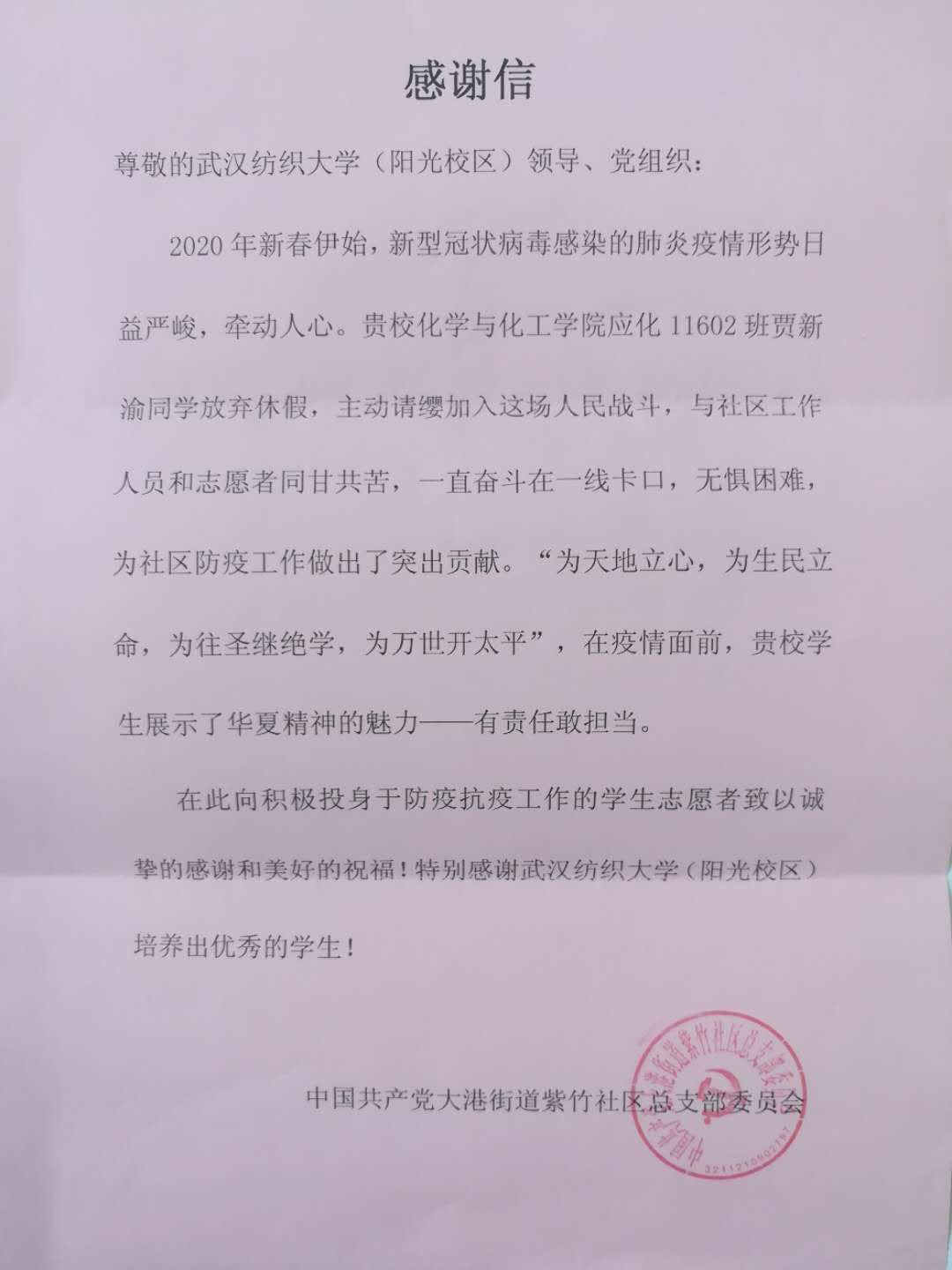 “为天地立心,为生民立命,为往圣继绝学,为万世开太平”,信中,高度肯定了我校大学生在疫情面前充分展示了“有责任敢担当”的精神魅力,特别感谢学校培养出来的优秀学生。对化工学院16级本科生党员贾新渝同学主动申请加入防控抗“疫”的人民战斗的志愿行为表示诚挚的感谢和美好的祝愿,对其与社区工作人员及其他志愿者同甘共苦,一直奋斗在一线卡口,无惧困难,为社区防疫工作作出突出贡献表示充分肯定。