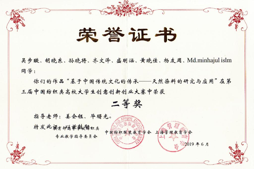 本次大赛自2019年年初开赛以来,历时5个多月,全国45所纺织类高校的208个参赛项目进入海选,参赛高校和参赛项目创历史新高。组委会组织专家进行复赛评审,从实用性和创新能力、产品服务、市场分析、营销策略、方案实现等方面对复赛项目进行了评价,最终共有70个项目入围全国总决赛。我校参赛项目,旨在关注绿色环保与生命质量,目前研发与生产的天然植物染料产品,拥有很大程度上解决传统草木染稳定性差、染色织物的牢度差、染色过程中的重现性差等的缺点,保留传统草木染杀菌解毒、消炎止血、生物可降解性和环境相容性良好等优点,适应当今现代工业化生产要求的创新性,受到评委专家们的一致青睐受到评委专家们的一致青睐,最终脱颖而出荣获二等奖。