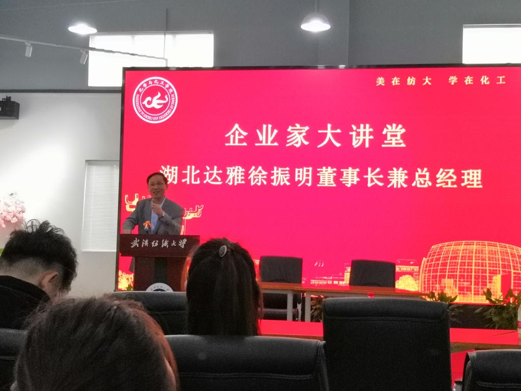 11月17日上午,湖北达雅生物科技股份有限公司董事长兼总经理徐振明一行,应邀做客化工学院“企业家大讲堂”,做了题为《理想与现实 兴趣与选择》的讲座,和广大学子畅谈个人创业经历,分享就业和创业过程中的体会。讲座由化工学院党委书记樊敏主持。