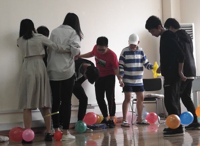 接下来的“踩气球”活动中,同学们将气球绑在腿上,争抢着去踩别人的气球。在尖叫呐喊声中,同学们进一步拉近了彼此之间的距离。