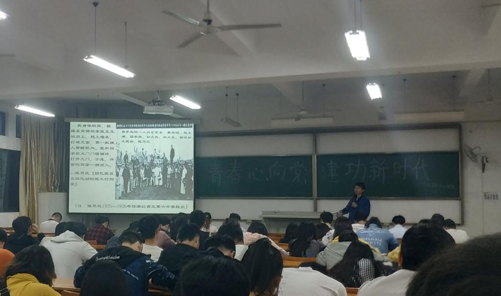 的历史,“二十一条”、“巴黎和会”将同学们拉回了一百年前羸弱的旧中国。进步学生摇旗呐喊救国救亡,奋笔血书“还我青岛”,呼吁各界人士参与到斗争中来,通过老师的讲述同学们仿佛再次回到了历史的洪流中,感受着进步青年浓烈的爱国情怀,体会着“爱国、进步、民主、科学”的五四运动精神,进步青年们悍不畏死、一心救国的情怀感染着每一名在场同学。谈及五四运动的意义,谈鹏老师说道:“五四运动发动了二十多个省,多阶层的群众参与到运动中来,是一次彻底的翻地反封建的革命运动。这次运动启导了人民的觉悟,团结了革命的力量,进一步促进了马克思主义的传播,为后来中国共产党的成立提供了思想条件和干部条件,标志着中国新民主主义革命的开端。”
