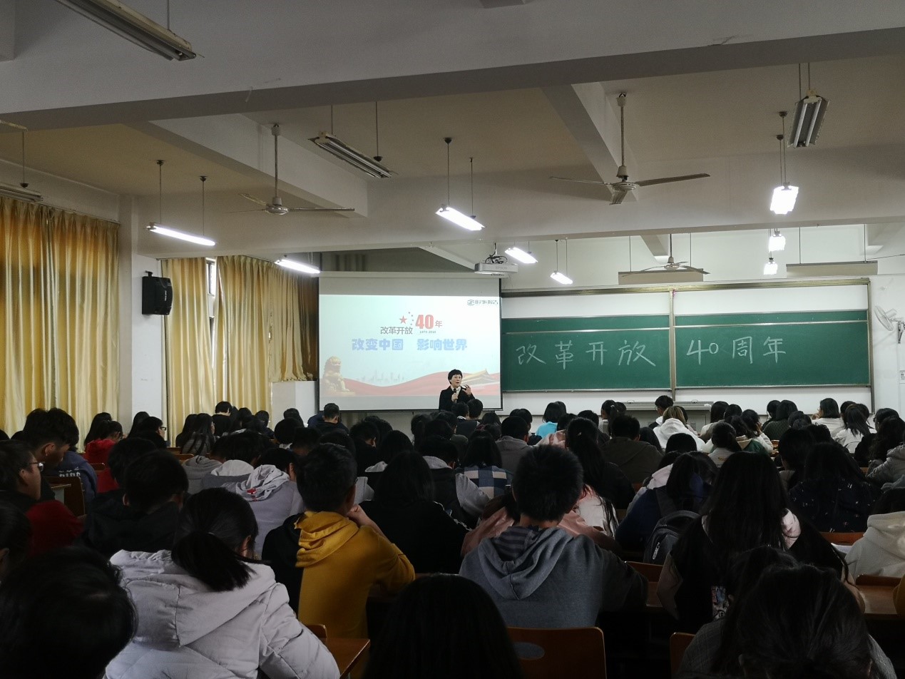 11月29日,化工学院2018级学生在胡子英老师的主持下开展了庆祝改革开放40周年主题年级大会。本次大会的主要目的是让同学们学习改革开放40周年的相关知识,并提升同学对时事的重视。