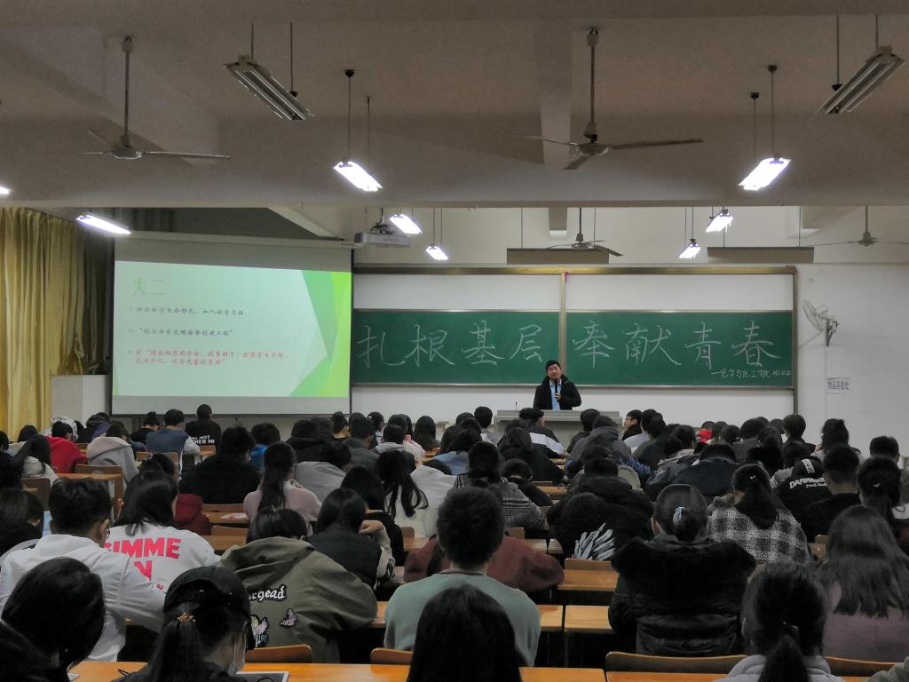 11月25日下午五点,化工学院于6栋210教室开展朋辈领航,主题为“扎根基层,奉献青春”,此次讲座由2017届毕业生莫亮主讲。