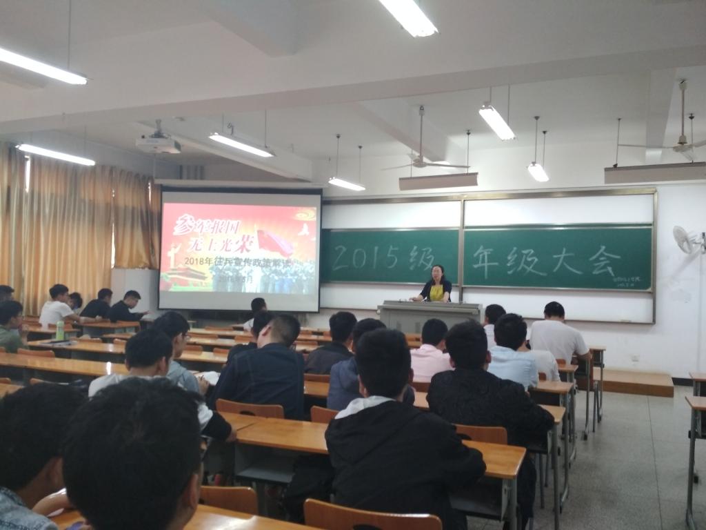 为响应学校2018征兵工作会议要求,让化工学子全方位了解征兵政策,积极投身军营,化工学院各年级召开征兵动员会。本次动员会由各年级辅导员主持,学院全体学生参加此次动员会。
