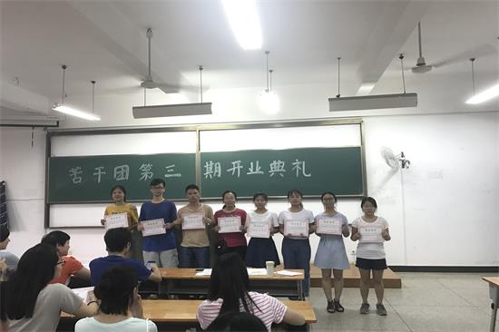 6月18日下午18:00,武汉纺织大学化工学院第三期苦干团开业典礼暨第二期苦干团结业典礼于6栋212召开。化工学院分党委副书记凡蓉蓉、辅导员胡子英、王娟娟、谈鹏出席了此次典礼。