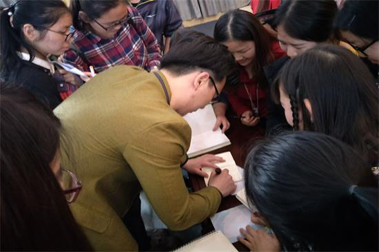 陈铭老师演讲后,在台下互动期间,陆续与同学们合影留念,并公布了自己的微博,告诉大家,对于人生的一些疑惑,大家都可以在微博上私信他,他会一一回复。最后,陈铭老师告诫同学们:“永远要保持好奇心,对未知保持强烈的冲动感,是你成功的最大动力。”语毕,潮水般的掌声再次充满了整个国际学术报告厅。(通讯员:谈鹏 赵梓江 王麦迪)