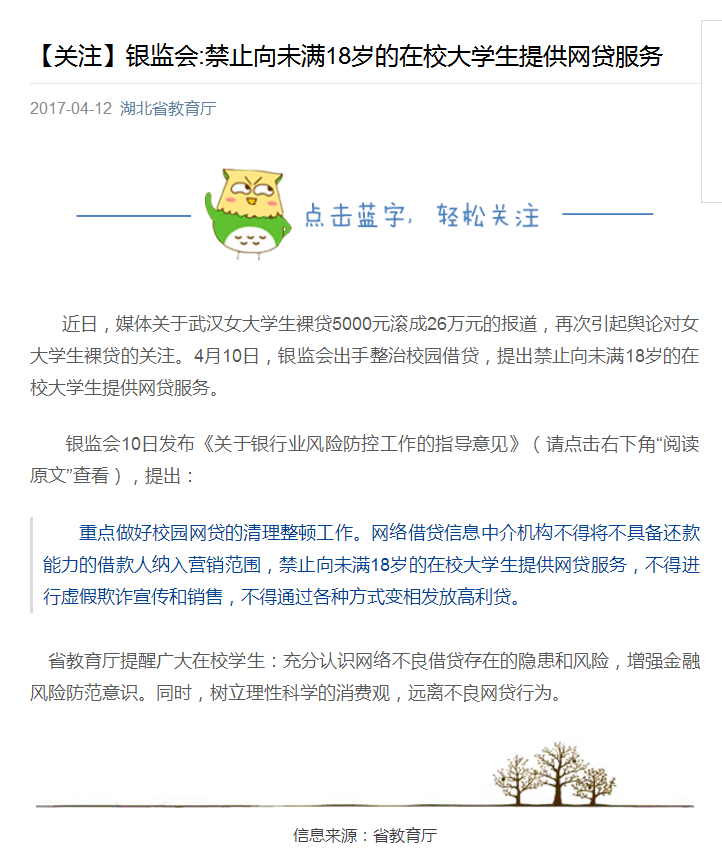 【关注】银监会:禁止向未满18岁的在校大学生提供网贷服务