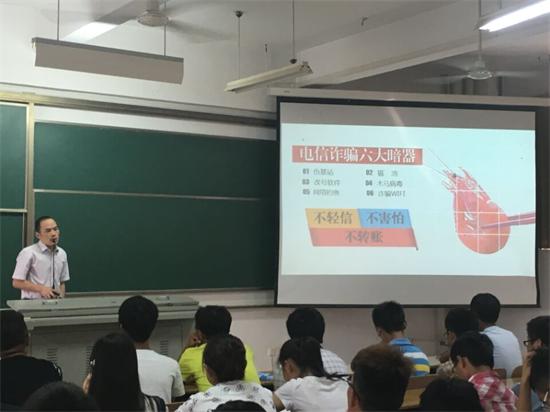 在讲解这两个安全问题时,蒋卫城列举了郑德幸、许俞俞等多起校园网络被骗案的惨痛案例。同时,他也从身边列举了许多真实发生的案子,其目的就是为了让新生们提高网络安全意识。除此之外,蒋卫城还在校园盗窃、校园消防、传销等方面做了详细的安全讲解。