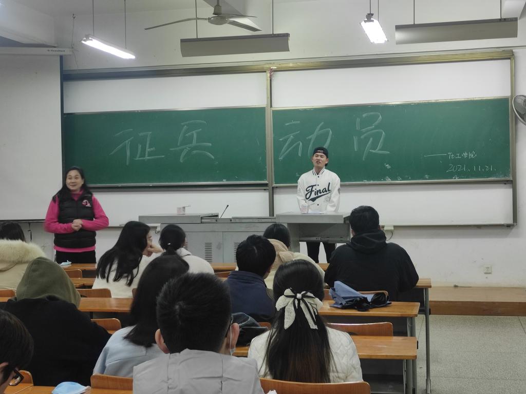 11月21日晚点名时间,化工学院召开毕业生征兵动员会,此次动员会由退役学生姚奎主讲,2022届毕业生参会。