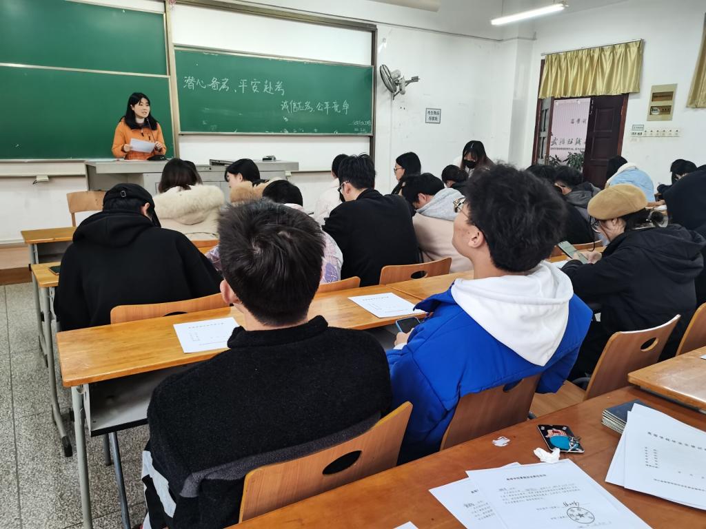 12月22号,临近研究生入学考试,为提升考生信心,规范考生行为,学院召开动员大会暨考风考纪教育大会,会议由学院党委副书记尤雯文、18级辅导员胡子英老师组织召开。