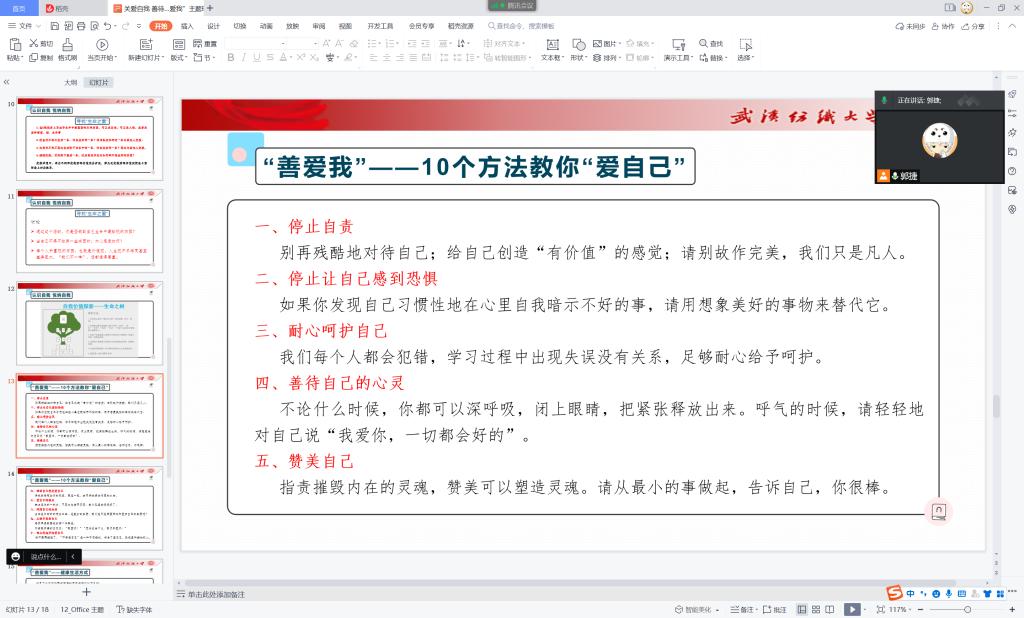 通过本次会议,让同学们学会正确善待自我、关爱自我,怀着温暖、包容的情意欣赏和接纳全部的自己;以积极、豁达的心态体验我们生活中的每一次经历;并以这个态度,善爱他人,善爱自然,善爱社会。最后针对近期频发的电信诈骗,各年级辅导员提醒大家提高防范意识,绝不轻信他人。