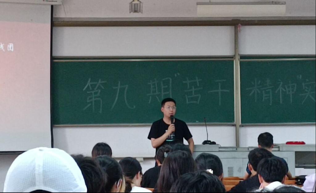 典礼的第三项由苦干团第九期新晋学生代表周骏鹏发言,周骏鹏说到作为“苦干团”的一员,应该将这个时代对青年的期望转化为大学生的精神风尚和实践素养,并且持之以恒地学习,积极参加社会实践活动,努力为学院、为学校奉献自己的力量。