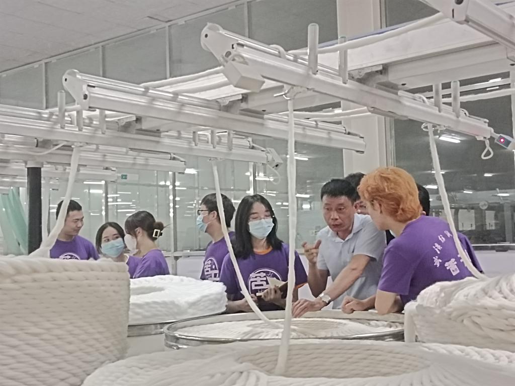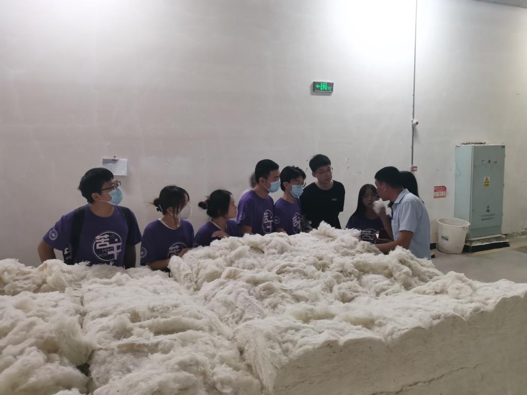 在工作人员的介绍中,队员们对现如今的纺织品的原料组成、性质有了一定了解,值得一提的是,该公司采用的都是新疆棉花,因其纤维长度、手感、质地等皆为棉花中的上品,从而颇受纺织行业的青睐。新疆棉的火热也代表着全国纺织行业的爱国之情,国产棉花是真的行!