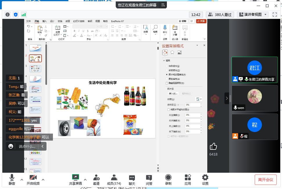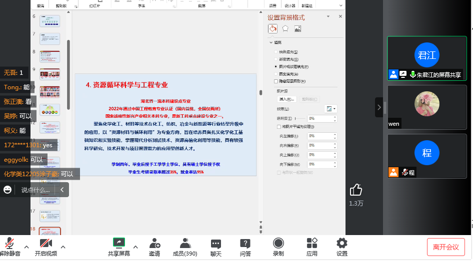 随后,针对新生们的提问,朱君讲进行了一一解答。化学类12206刘子琪提问说:“前期通过和学长学姐的交流,发现很多人进入了实验室跟随老师做科研,请问大一刚入学适合马上进入实验室吗?”“本科生进入实验室做科研对考研时录取和导师招生有着巨大优势”,朱君江如是讲到,他积极鼓励大家要在学习中打好基础,培养学习能力,同时找到自身兴趣点,拓展专业知识面,提升自身思考问题、辨别是非的能力,树立专业报国的伟大抱负。“在学院的新闻网站上,我看到上一届的同学参加了全球化妆品武汉交易博览会,请问今年我们有可能参加吗?”化妆品12201夏诗雨班提问,朱君江回答到:“由于疫情的关系,现在学生们走出去参加社会实践的机会也变少了很多。这次在家门口开展的化妆品国际博览会,是一个很好的开展专业教育的实践活动。如果条件适合,一定会积极组织同学们参加。”