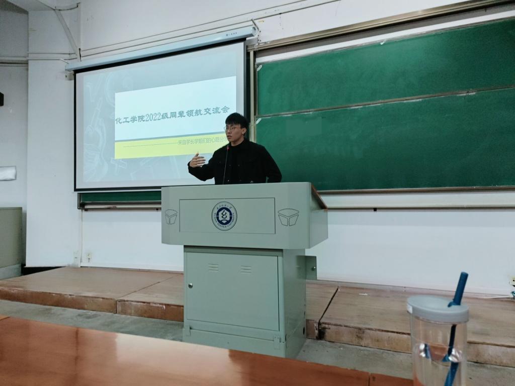 为帮助同学们树立学习榜样,明确学习目标,规划专业学习方向。化工学院于4月22日晚8:10于三栋教学楼T-202教室举办线下朋辈领航交流活动。交流会由化学工程与工艺专业已考取华东理工大学研究生的余一夫、轻化工程专业已考取东华大学的张思琪、应用化学专业已考取福州大学的李欣逸三位学生主讲,2022级辅导员程文杰及全体同学参加。