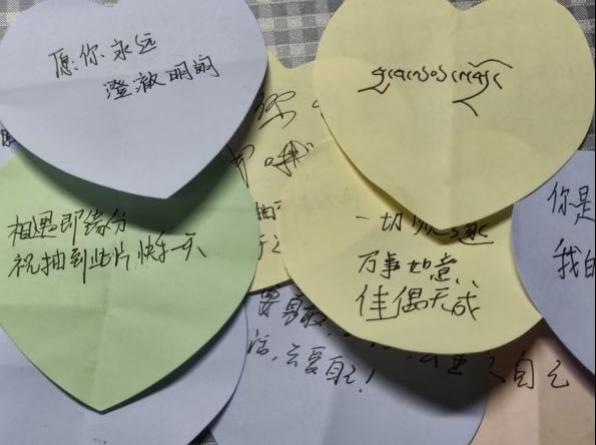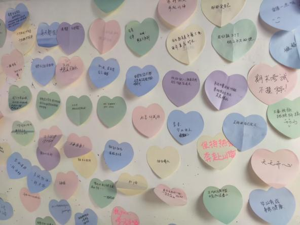 打开心扉,常有爱的海洋。以便利贴的形式写下自己对陌生人的祝福,给那些被负面情绪困扰的同学献上祝福,或是对自己心爱之人勇敢表达爱意,借此活动,同学们更加能够正视自己的内心,拥有更好的良好的心理素质,让爱在校院里传递下去。