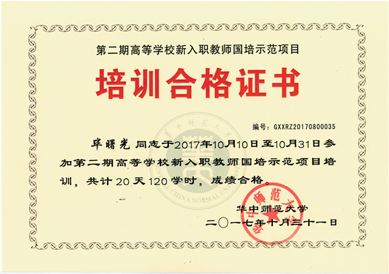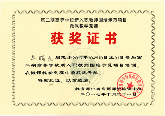 近日,我院新进教师毕曙光博士参加湖北省高校2017年新入职教师教学能力提升培训班载誉归来,荣获“优秀学员”和“微课比赛优秀奖”。