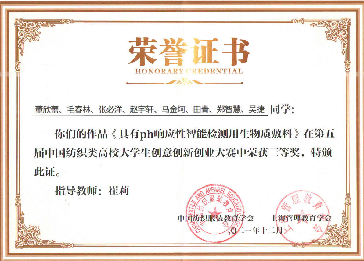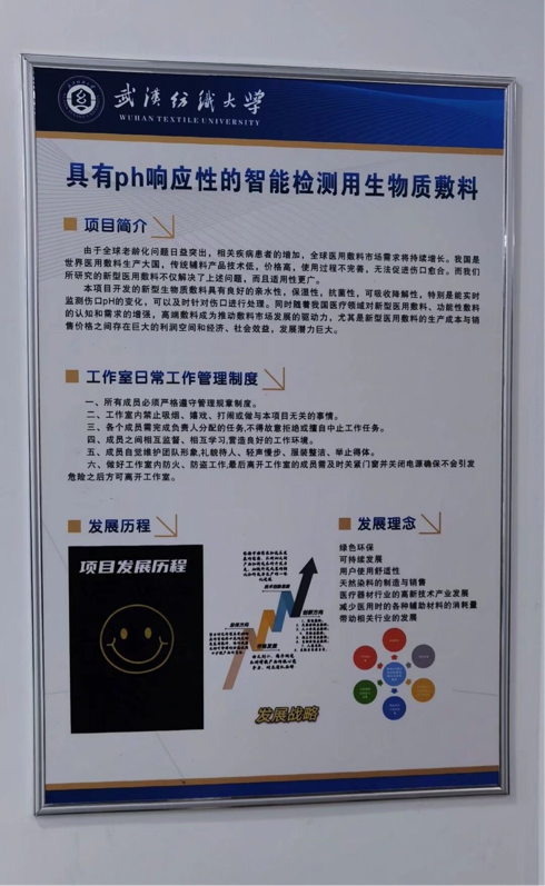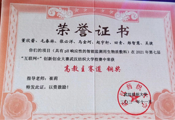 化工学院高度重视培养学生的创意创新创业能力,以学院创业苗圃为平台,积极鼓励学生参与并且输送优秀的团队加入学校创新创业孵化基地,孕育了不少优秀的创新创业作品。本次获奖的团队由轻化11902班董欣蕾同学担任负责人,团队核心成员毛春林、张必洋、吴捷等同学均来自同一课题组实验室。在团队成立以前,他们经常会去实验室协助学长学姐完成实验任务,积累了不少的实践经验,也得到了指导老师的认可,为日后的项目成果奠定了基础。初期团队在指导老师的带领下初步完成了一份商业计划书,并且在众多项目中脱颖而出,成功申请入驻本校的创新创业基地。其作品项目《具有ph响应性智能检测用生物质敷料》经过孵化基地一年的指导和打磨,曾参与第七届“互联网+”创新创业大赛武汉纺织大学校赛,荣获“高教主赛道 铜奖”。