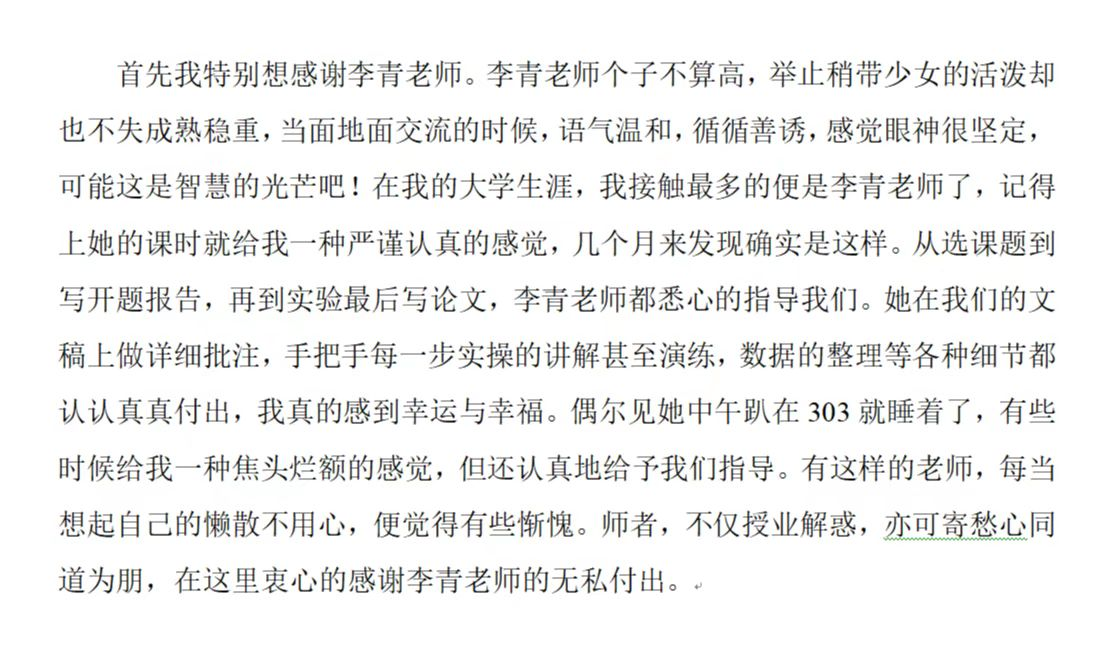 正如黄钟珩在论文致谢中所说,教师的种种教导会使毕业生受益终身。大学四年,教师主动走近学生、倾听学生,真情关心学生、关爱学生,正确引导学生、教育学生,将立德树人的根本任务落到实事,才能在毕业之际栽培出丰硕成果。