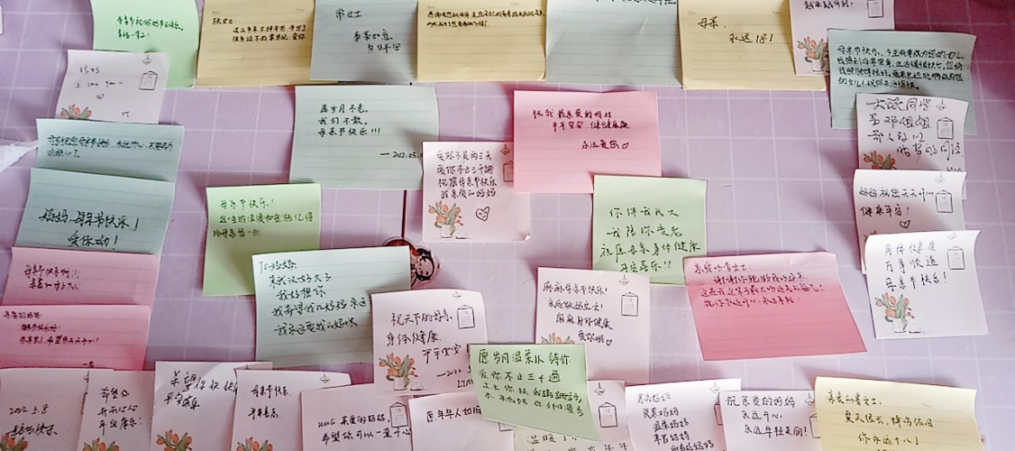 本次活动共有两种参与形式。第一种是在便利贴上书写送给母亲的话,第二种是在卡纸上画一幅关于母爱的简笔画。在活动现场同学们通过“情系便利贴”勇敢的表达了对母亲的知心话、温馨的祝福和怀念,满满的贴满我们的爱心展板。一张张充满故事和母爱的简笔画触动了大家的心。活动现场充满着浓浓爱意的氛围,同学们纷纷拿出手机,向远在他乡的母亲送上了节日的祝福,表达了深情的思念。
