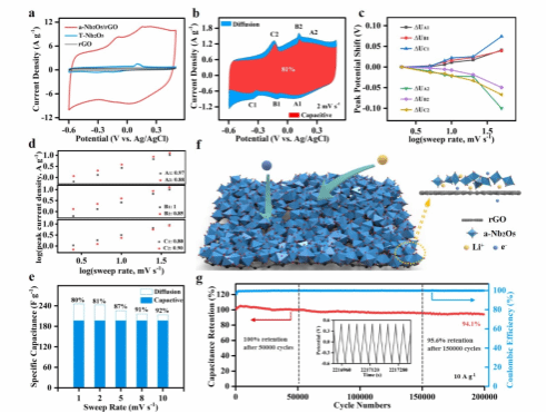 亚稳态非晶结构将为锂离子在电荷存储循环中提供足够的自由体积,减少离子反应过程中的体积变化,从而保证电极材料结构的稳定性。此外,二维纳米片的非晶结构通过开放的扩散路径形成可渗透通道,从而有效地促进离子扩散。这种与导电良好的还原氧化石墨烯网络紧密结合的多种独特结构,也为锂离子提供了更大的接触表面积和更短的扩散路径。